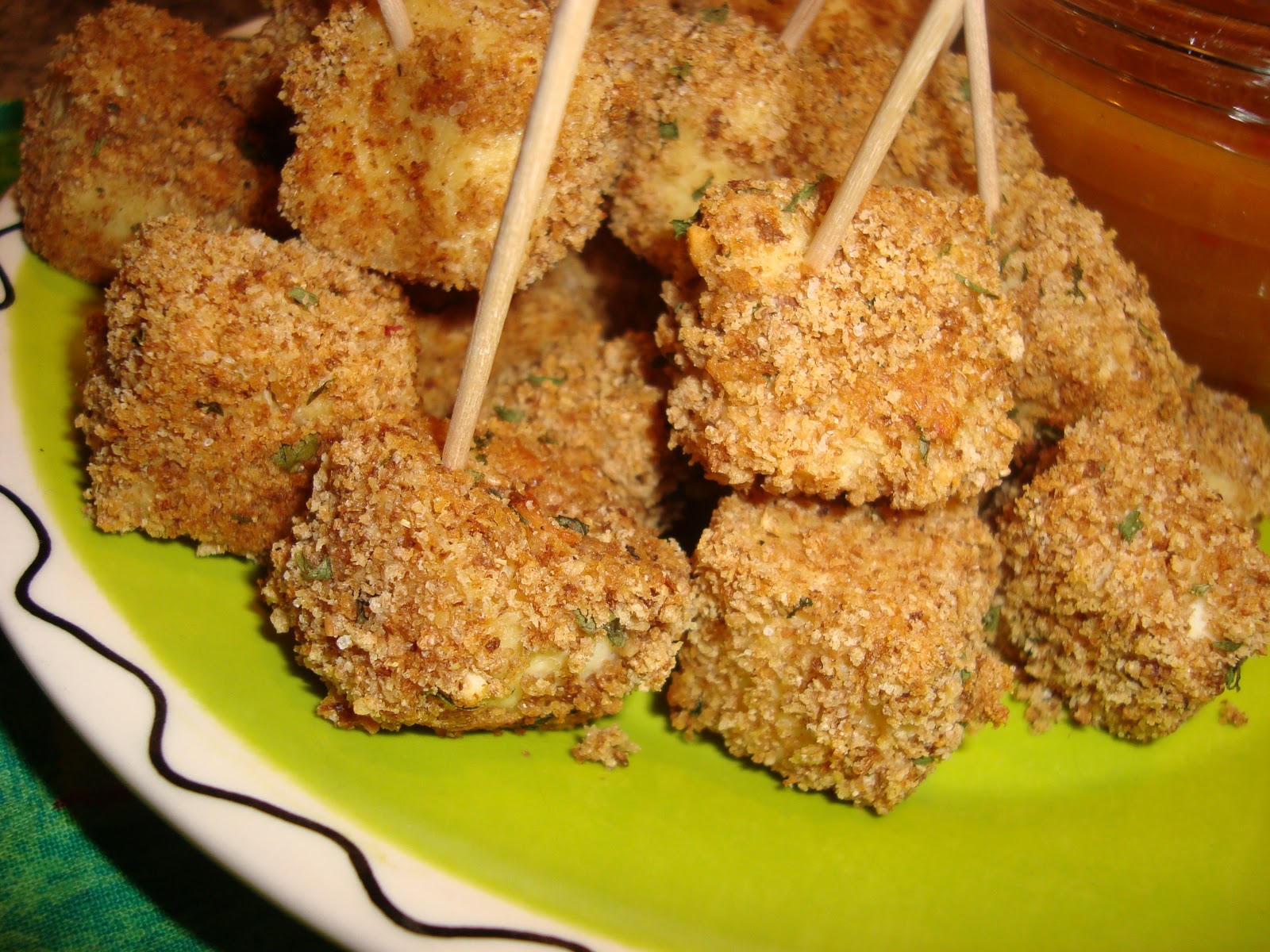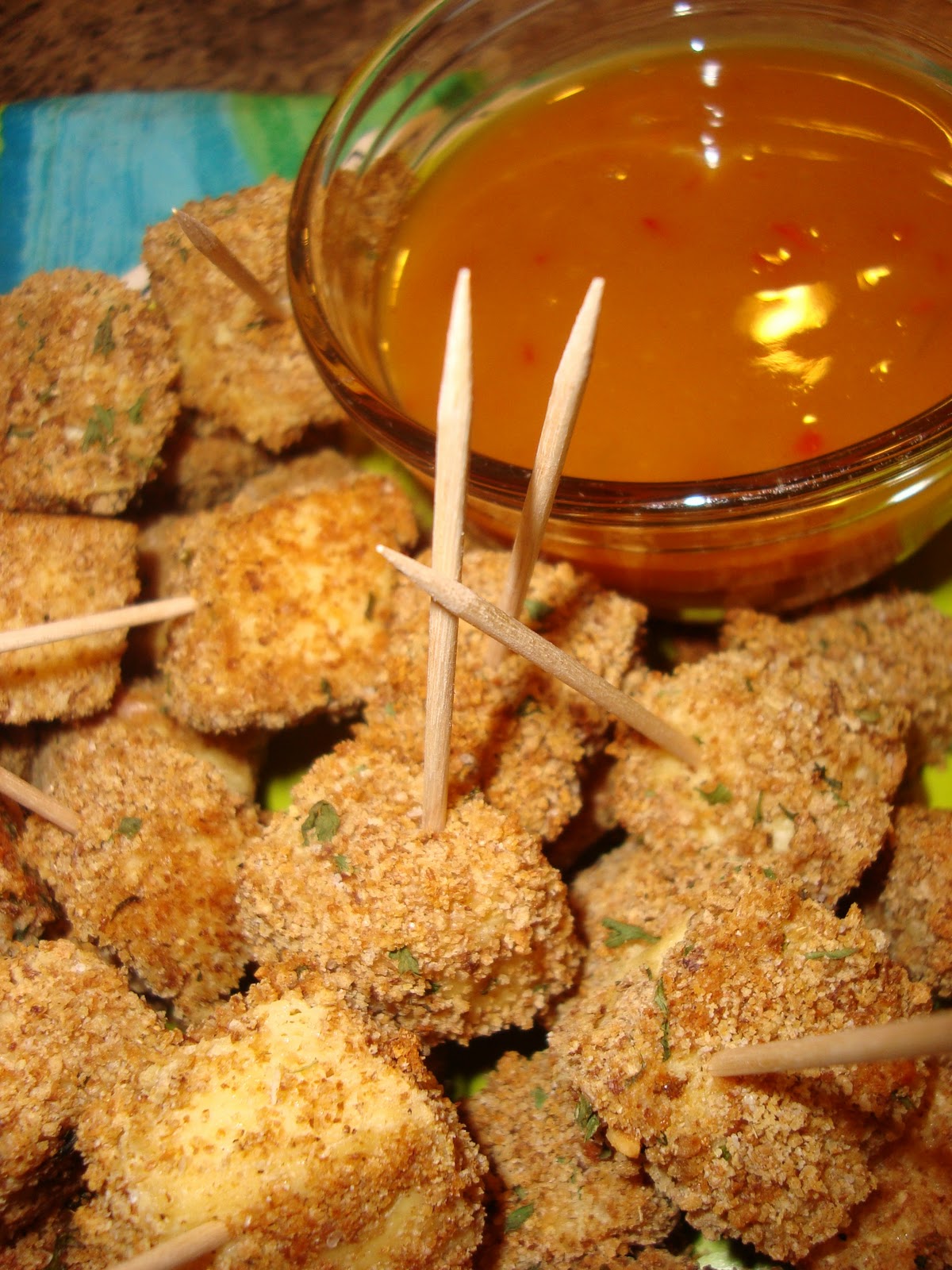 In short:Â the tofu nugget is making an appearance. Tofu is a fabulous meat alternative with lots of protein and calcium and pretty much takes on the flavor of whatever food you put it in. I tried to make something similar to this a few years back, but the recipe (or me) failed miserably. Â I found this other version on a vegetarian website called: