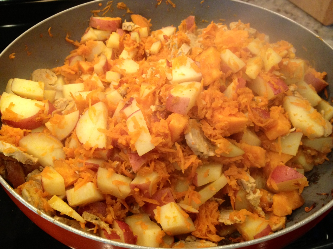 1) Heat oil in a large skillet. Add potatoes and carrots, and cook, covered, until the potatoes start to brown. About 5 minutes.