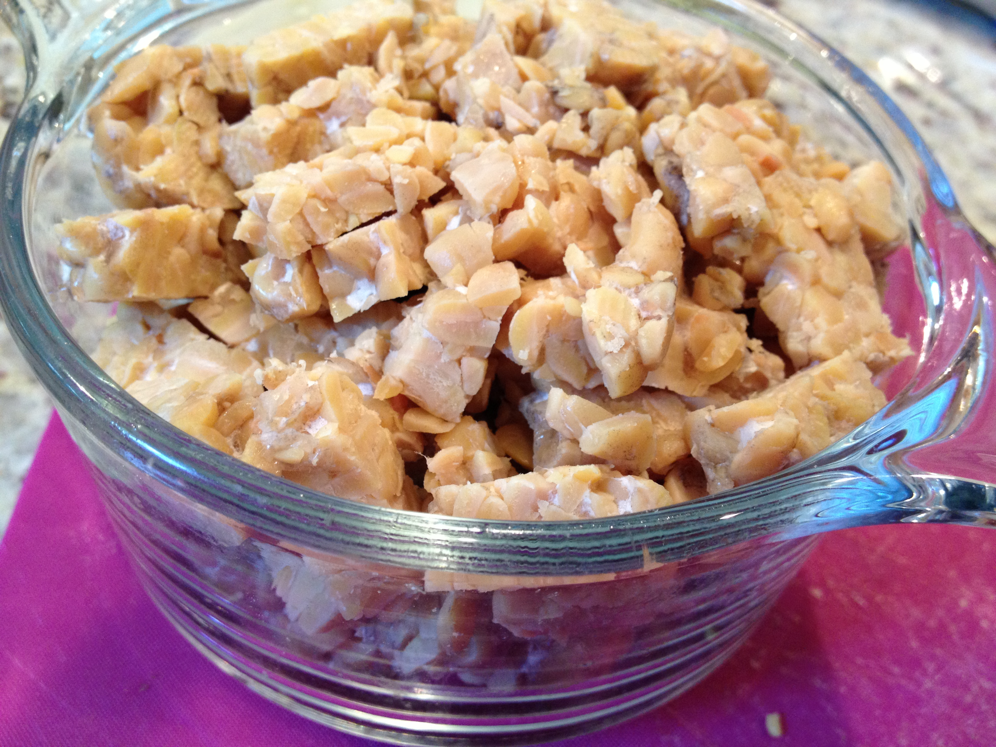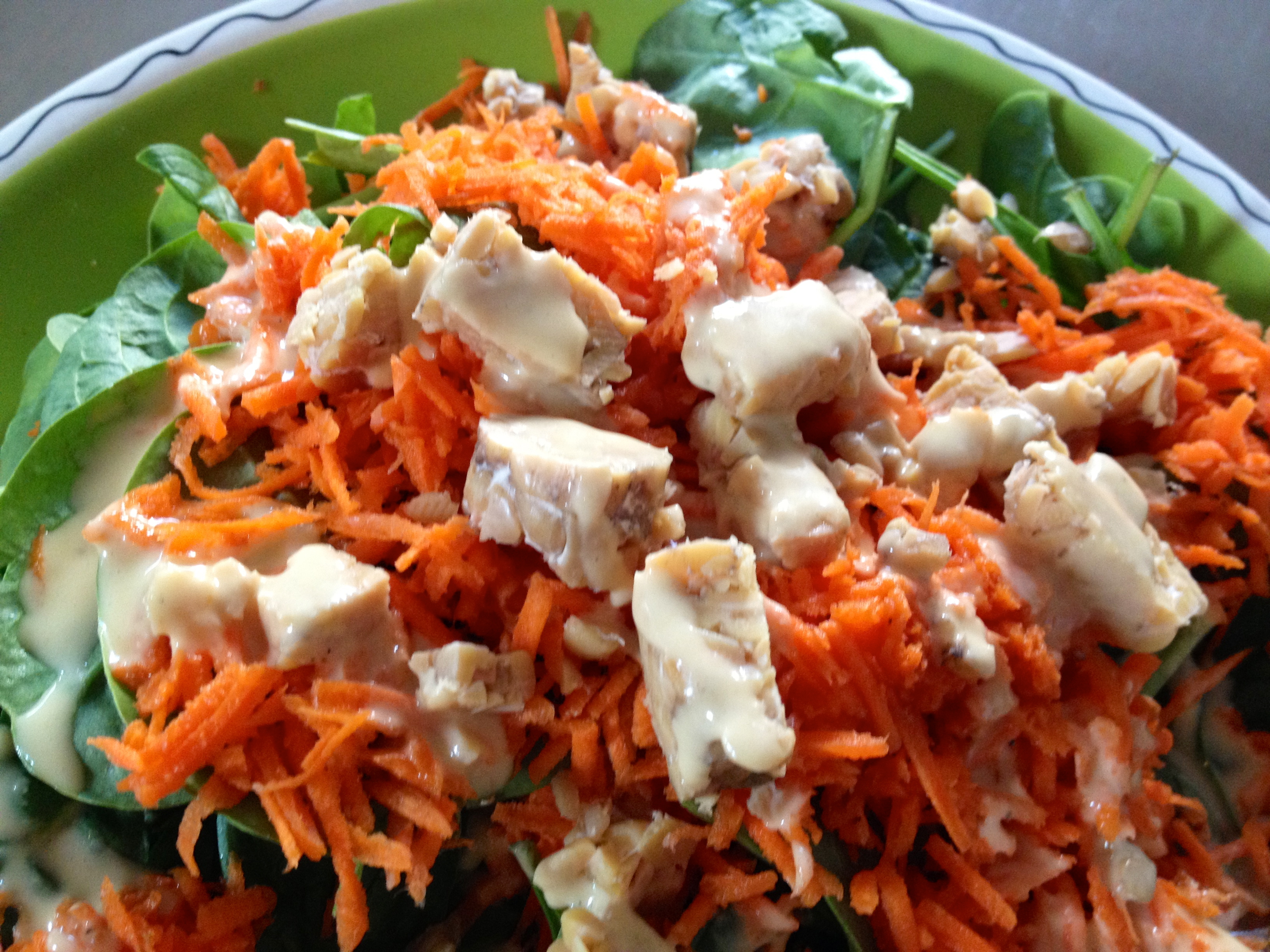 4. Distribute the greens equally on the plates. Sprinkle carrots evenly over your greens. Add your tempeh. Drizzle with your dressing.