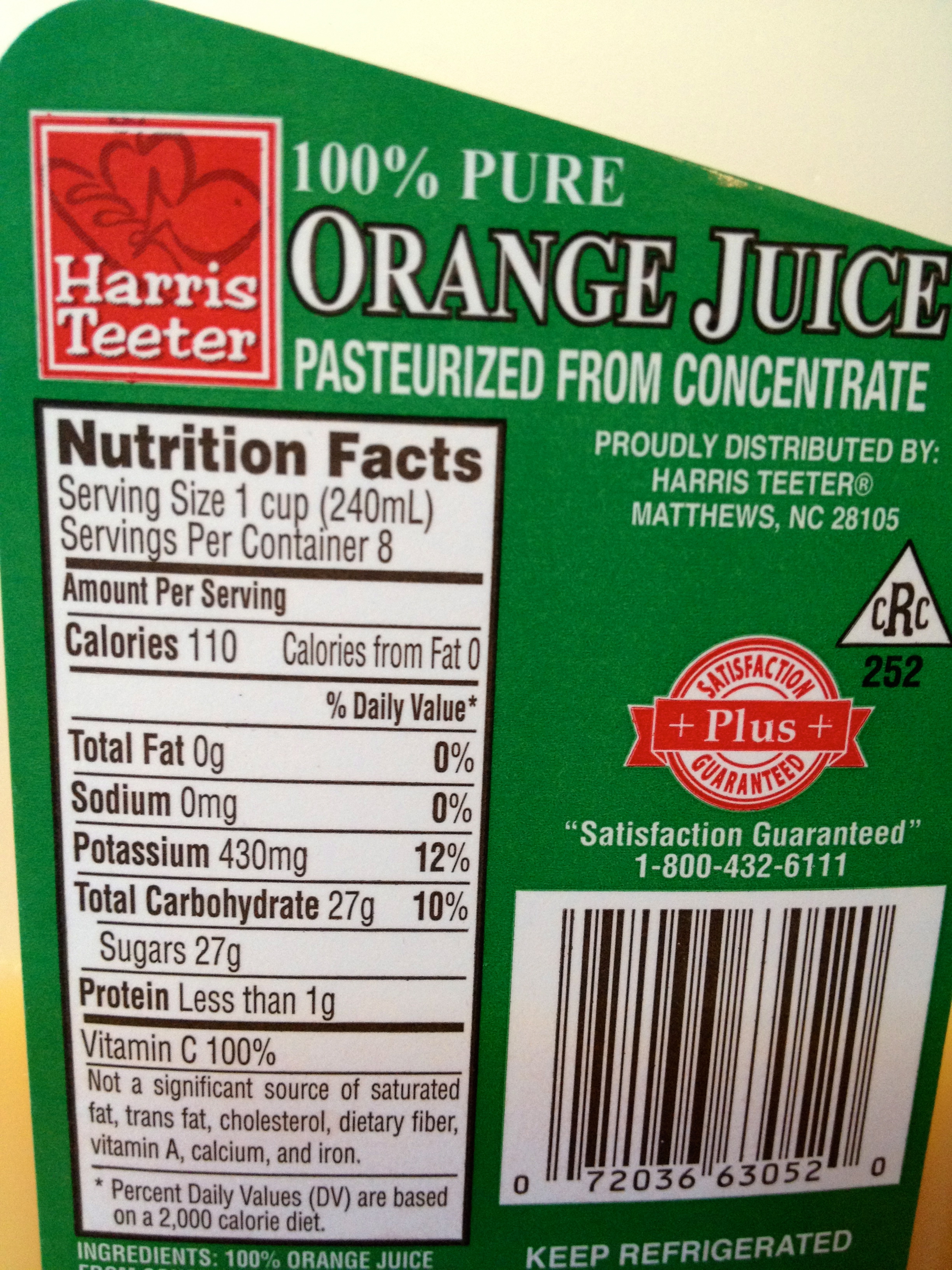 You say, “But I buy 100% orange juice. No high fructose corn syrup. That has to be good right?”