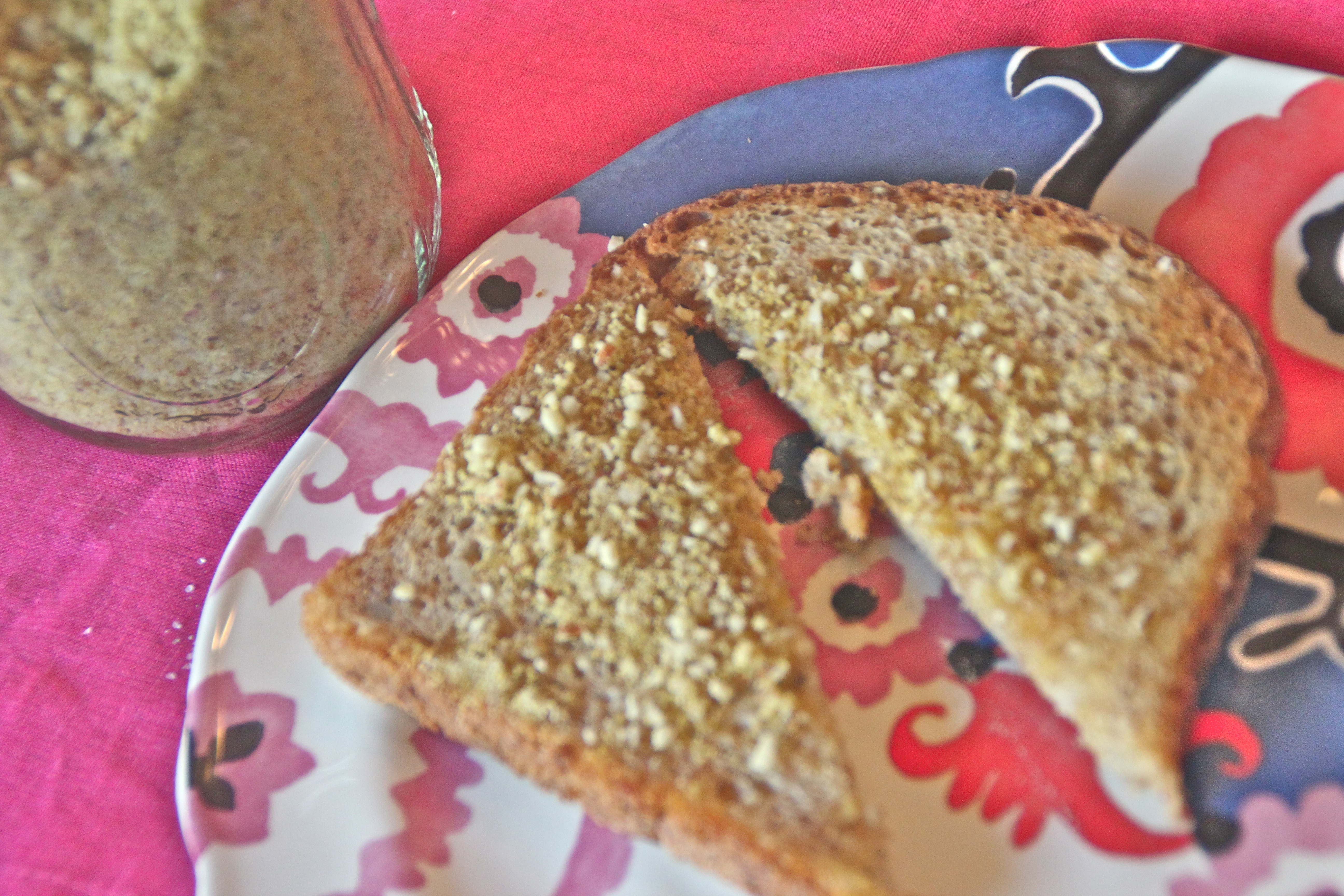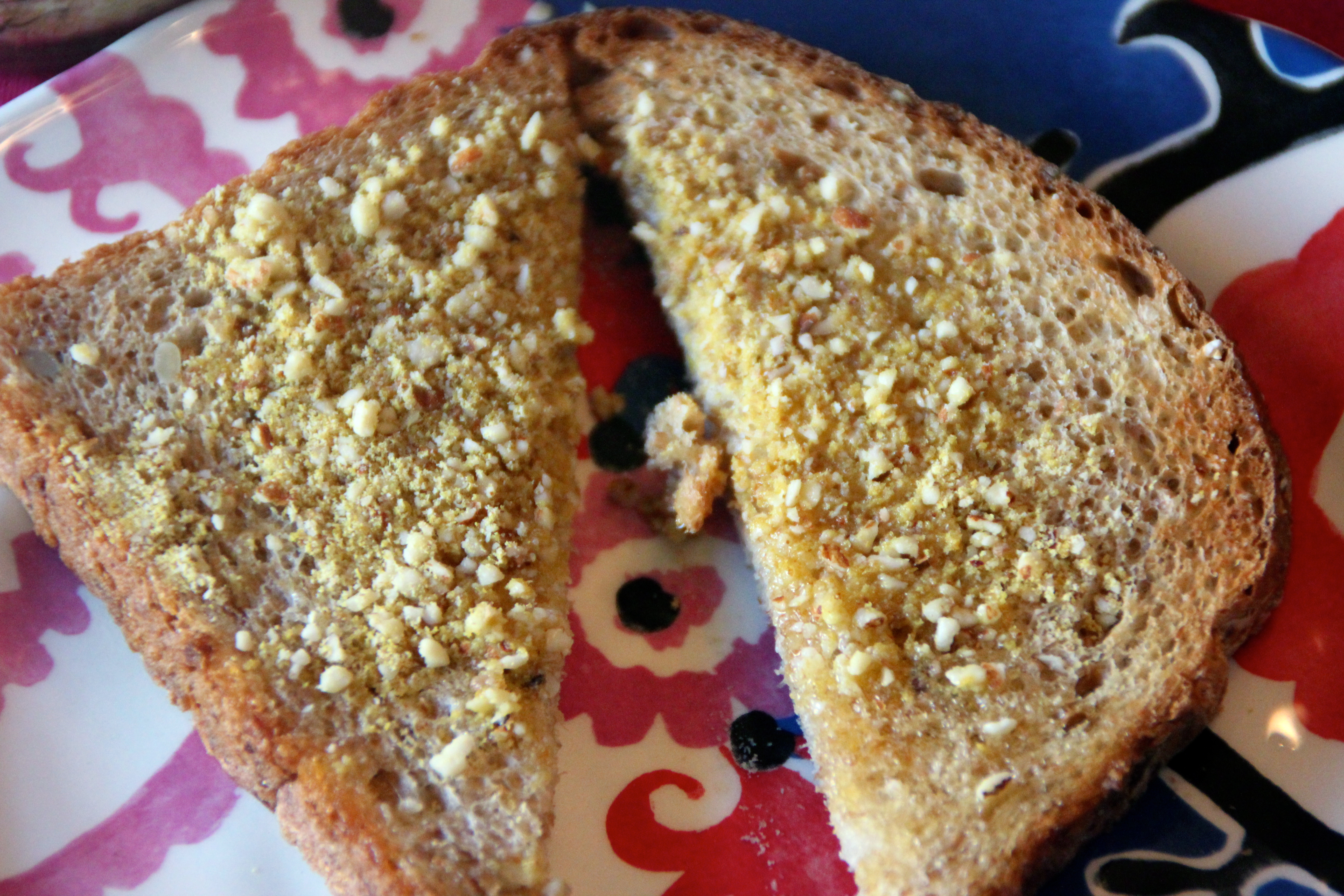 Often times I will buy a good whole grain baguette, toast it, spread a layer of coconut oil on it and then shake the “parmesan” on top. Coconut oil on warmed bread spreads nicely and the almond topping is a fantastic medley of flavors.