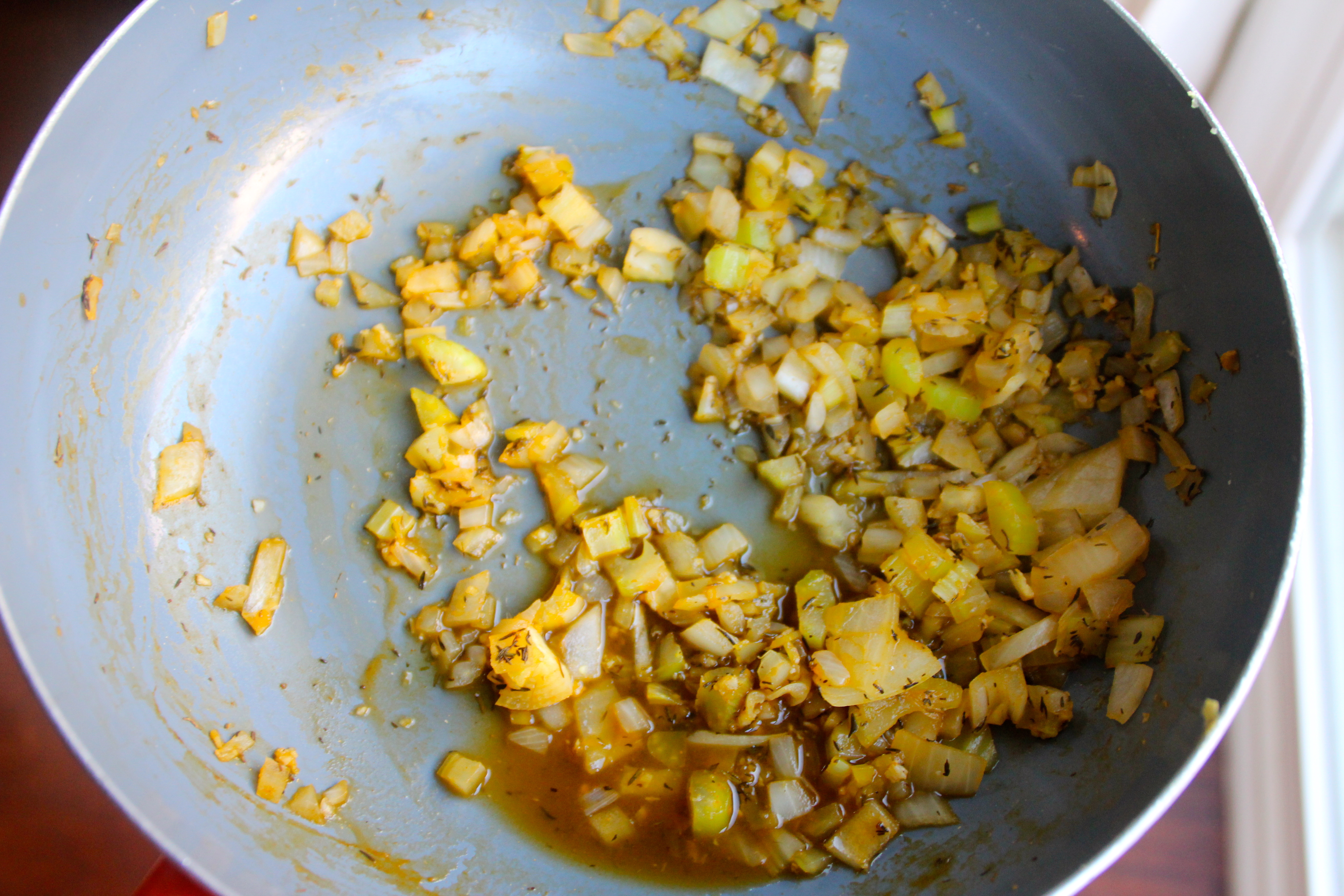 - Heat 2 tablespoons vegetable broth in a medium-sized skillet over medium heat. Add garlic, onion and celery and cook for 2-3 minutes or until onions are soft.