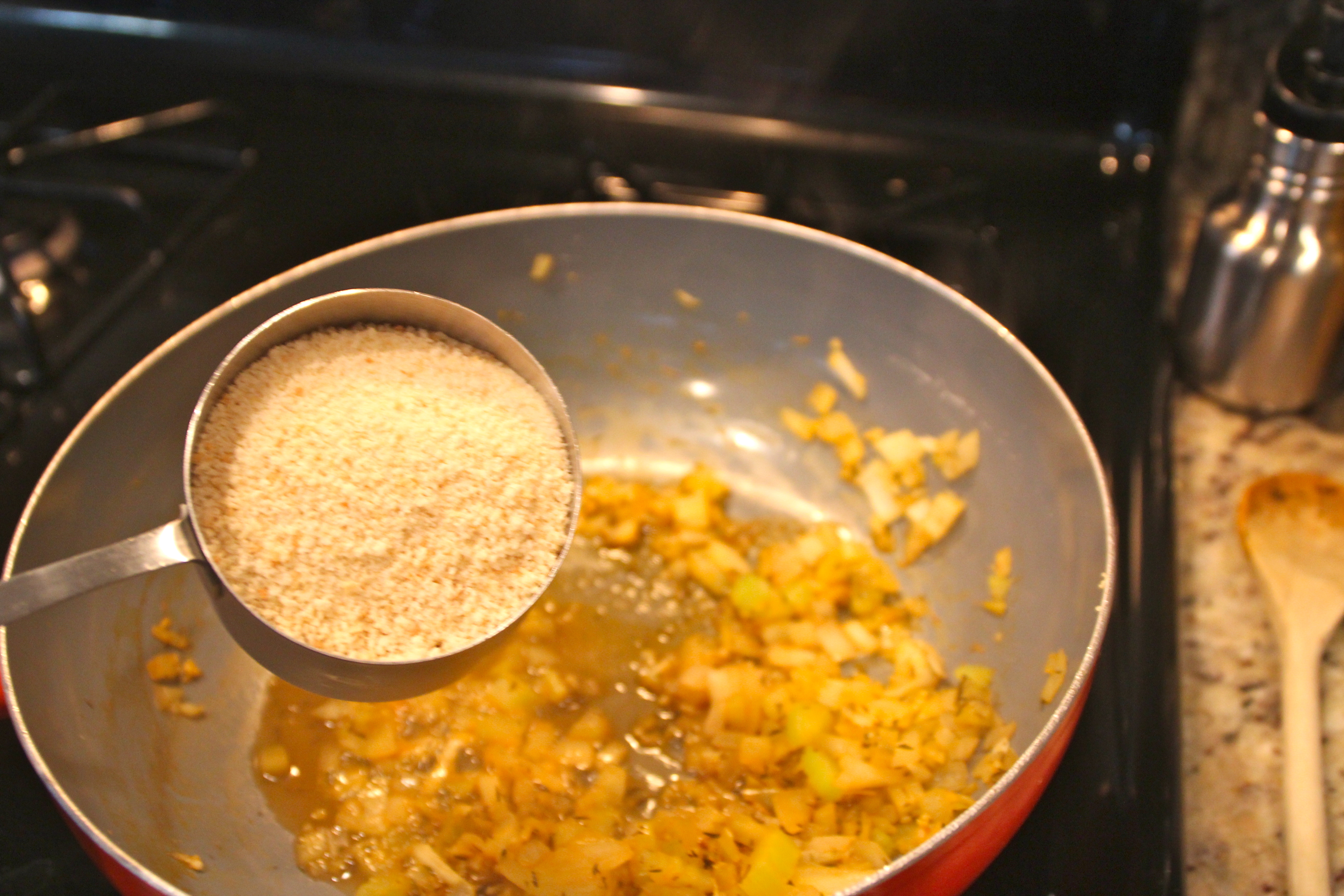 - Stir in remaining ingredients: thyme, aminos (or soy sauce), vinegar, honey, bread crumbs, and 2 more tablespoons vegetable broth.