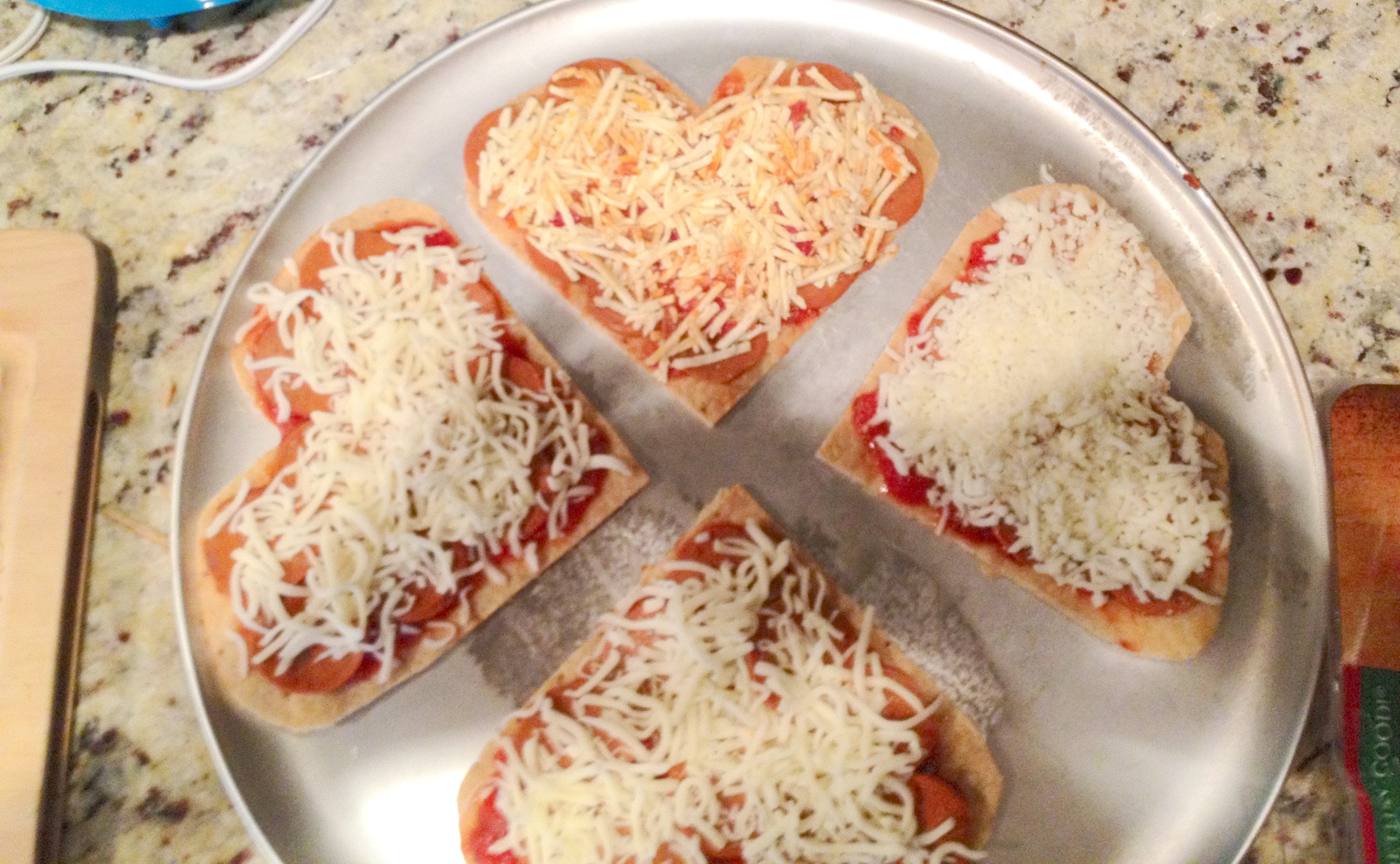 If you are a Pinterest reject like me and don’t want to feel like you have failed your kids in the fun-mom category, listen up. Valentine’s heart pizzas. So that it looks like you tried. A little.