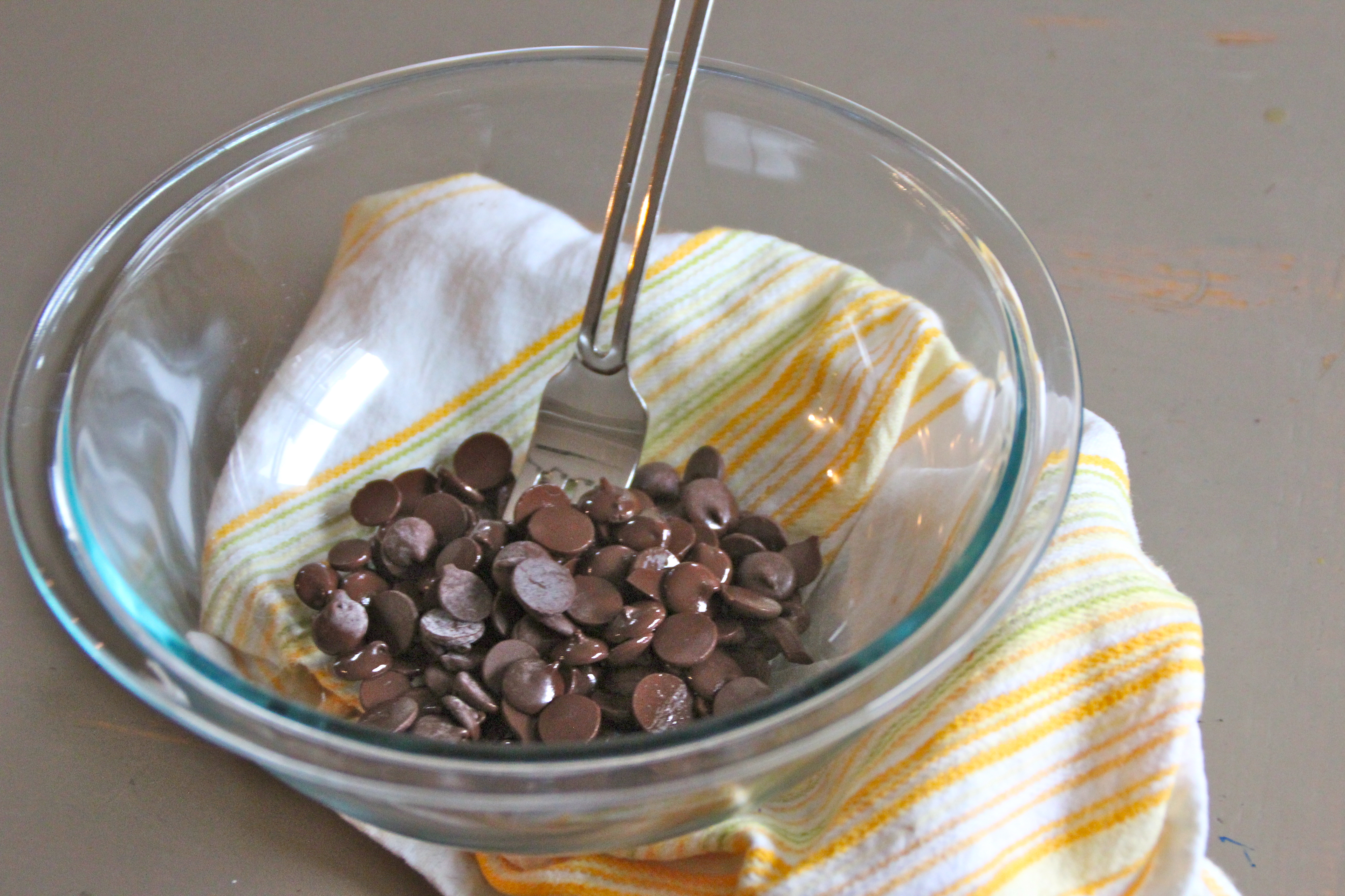 1. In a microwave safe bowl, melt the chocolate chips for about 60 seconds. Stir. Repeat with 15 second intervals until mostly melted.