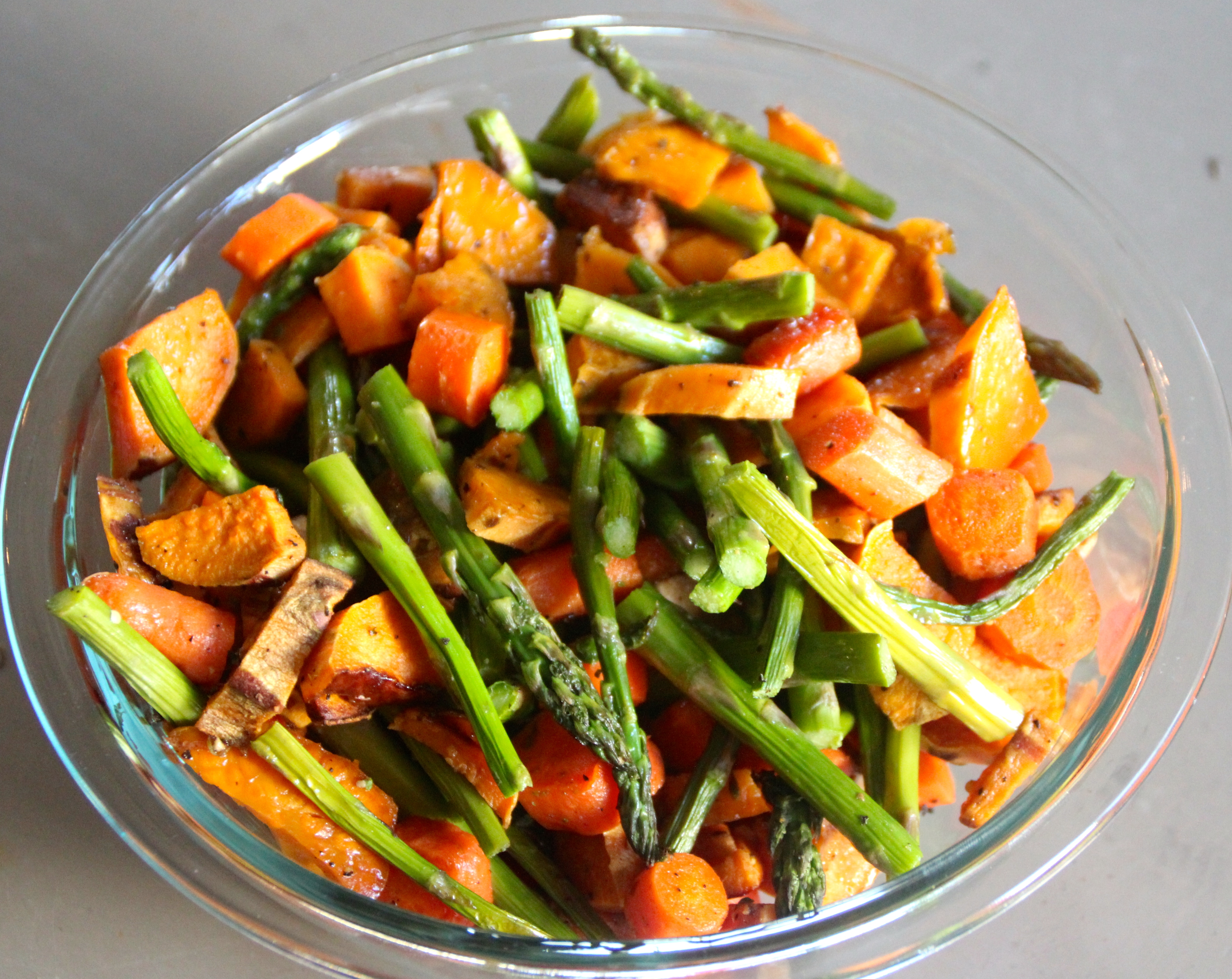 - Remove the baking sheet from the oven. Spread the asparagus over the sweet potato and carrots and bake in the oven for another 20 minutes.