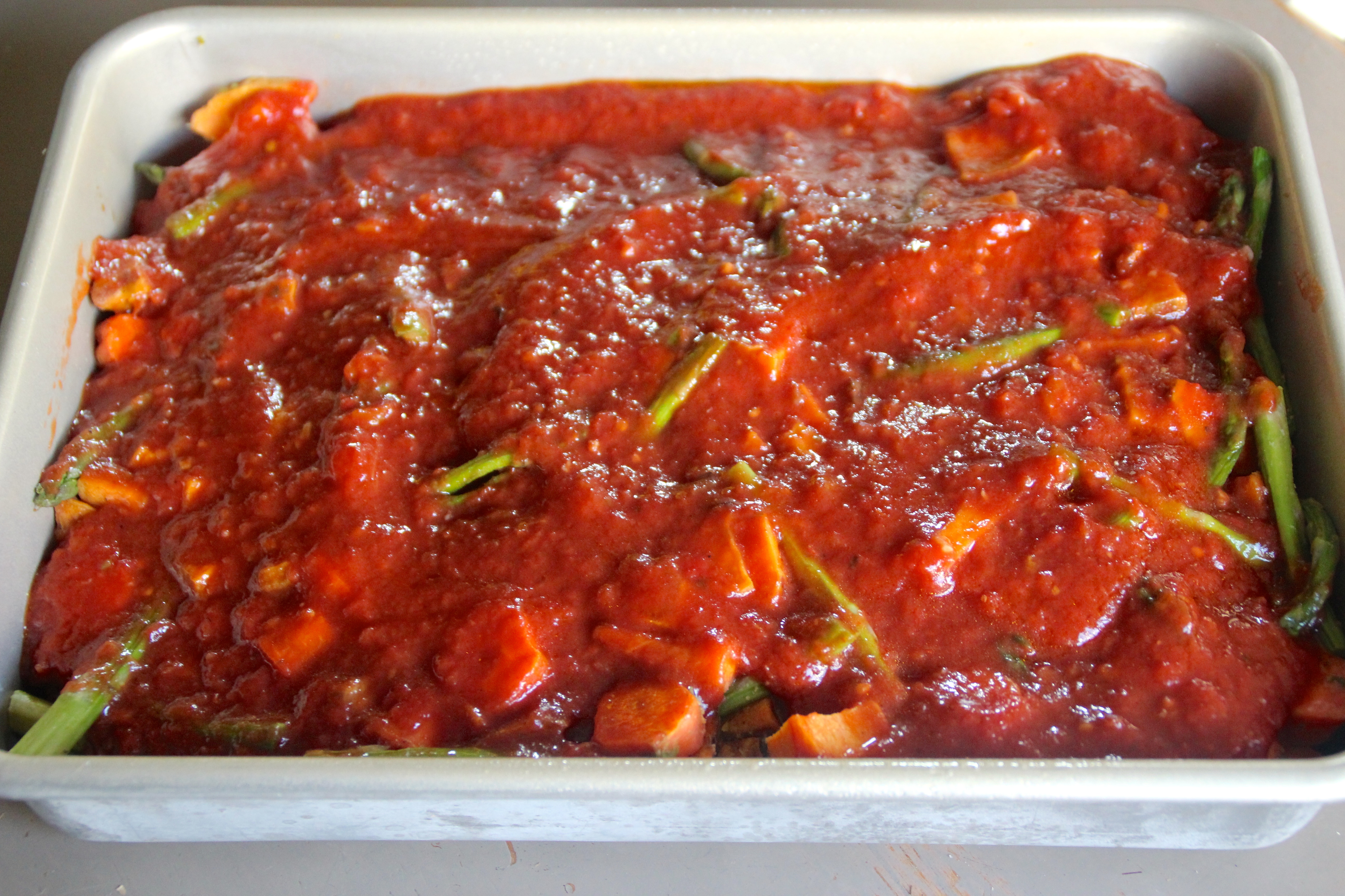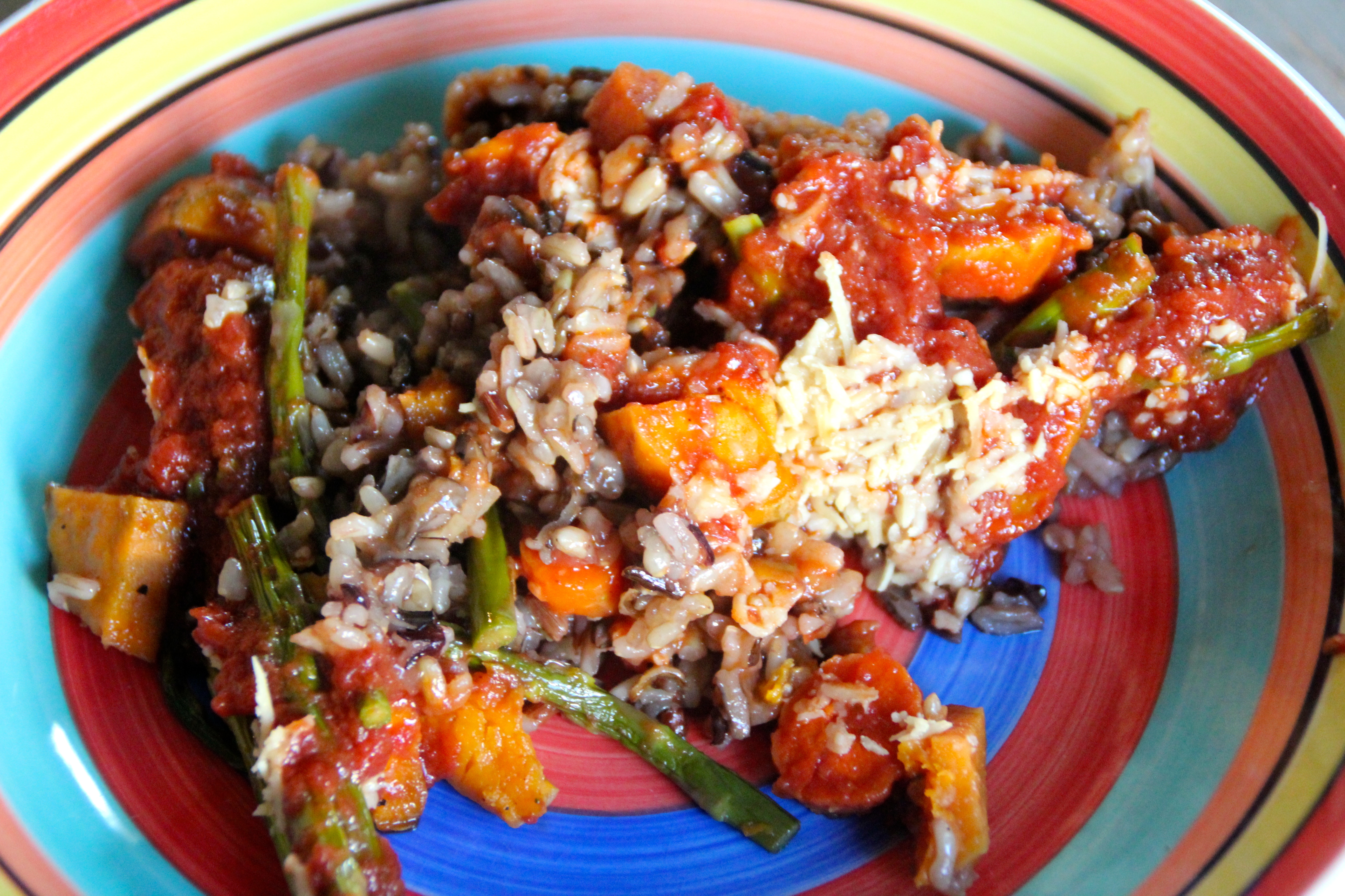 Speaking of tomatoes…Today’s recipe is a yummy marinara with rice and roasted veggies. This sauce was so good, I could have eaten it solo.