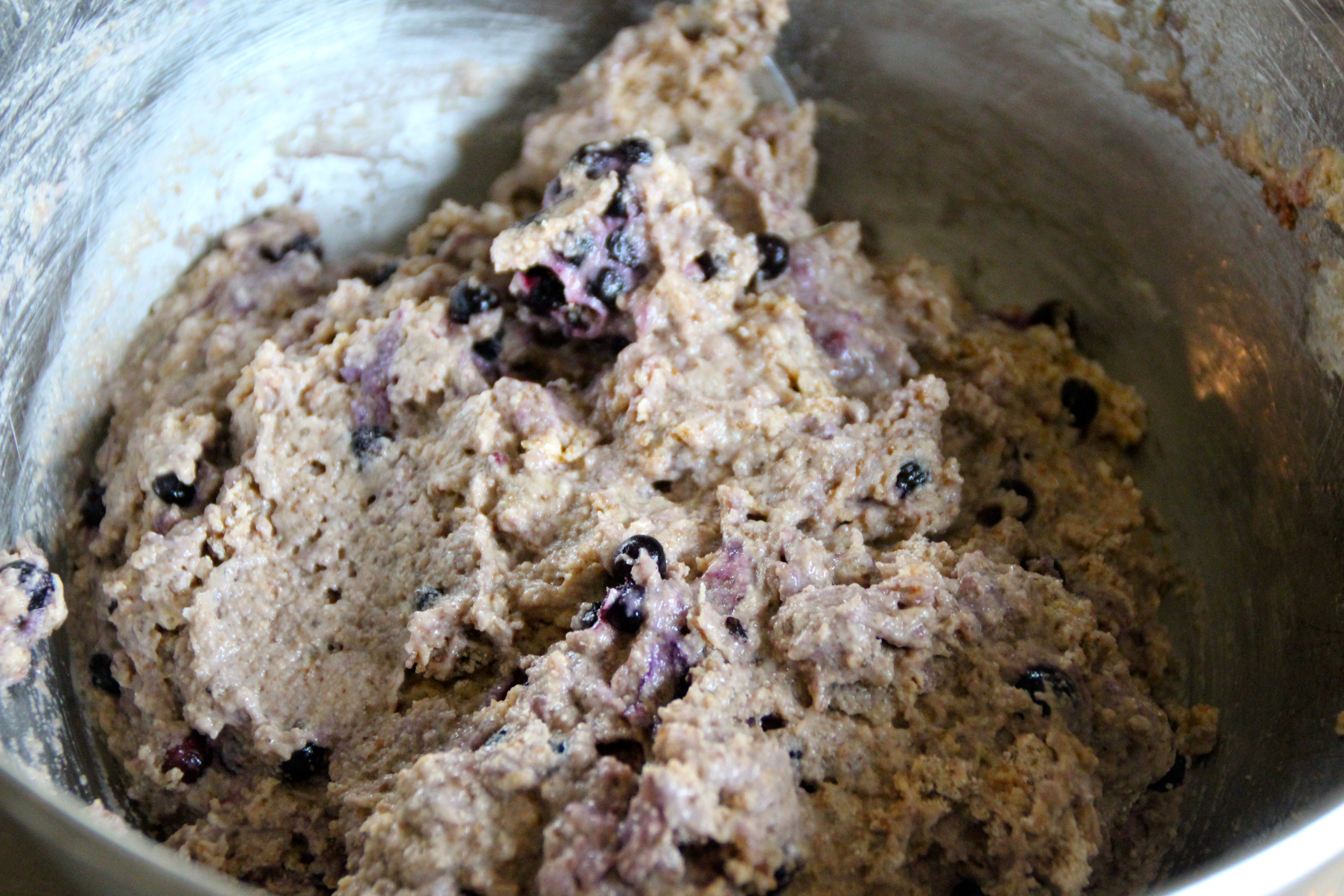 5) Add your frozen blueberries and stir again, just until combined. (As with all muffins, do not over-stir. If you do it will cause overly dense muffins)