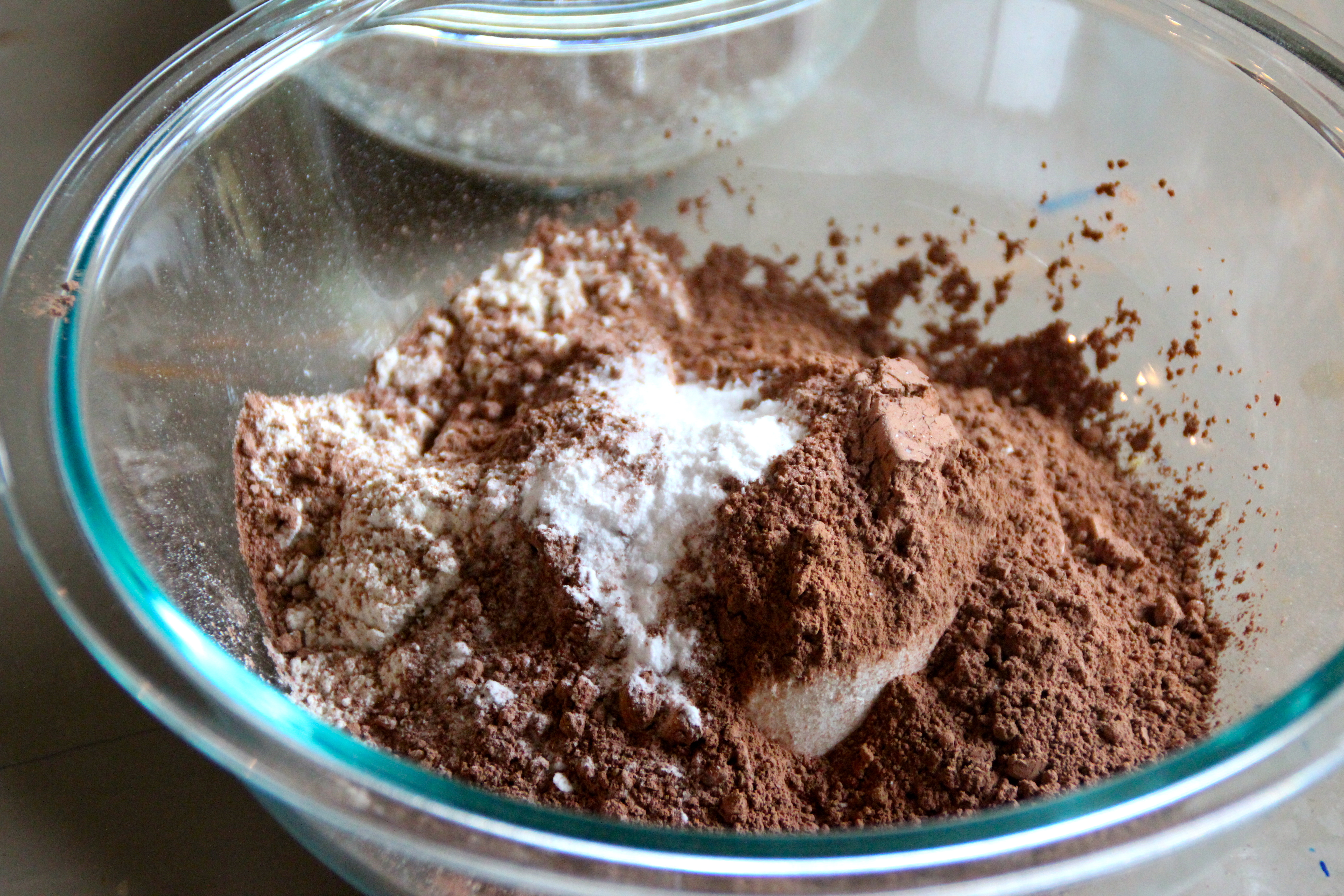 3. In a medium mixing bowl, mix together the flour, cocoa powder, baking soda, baking powder and salt. Set aside.