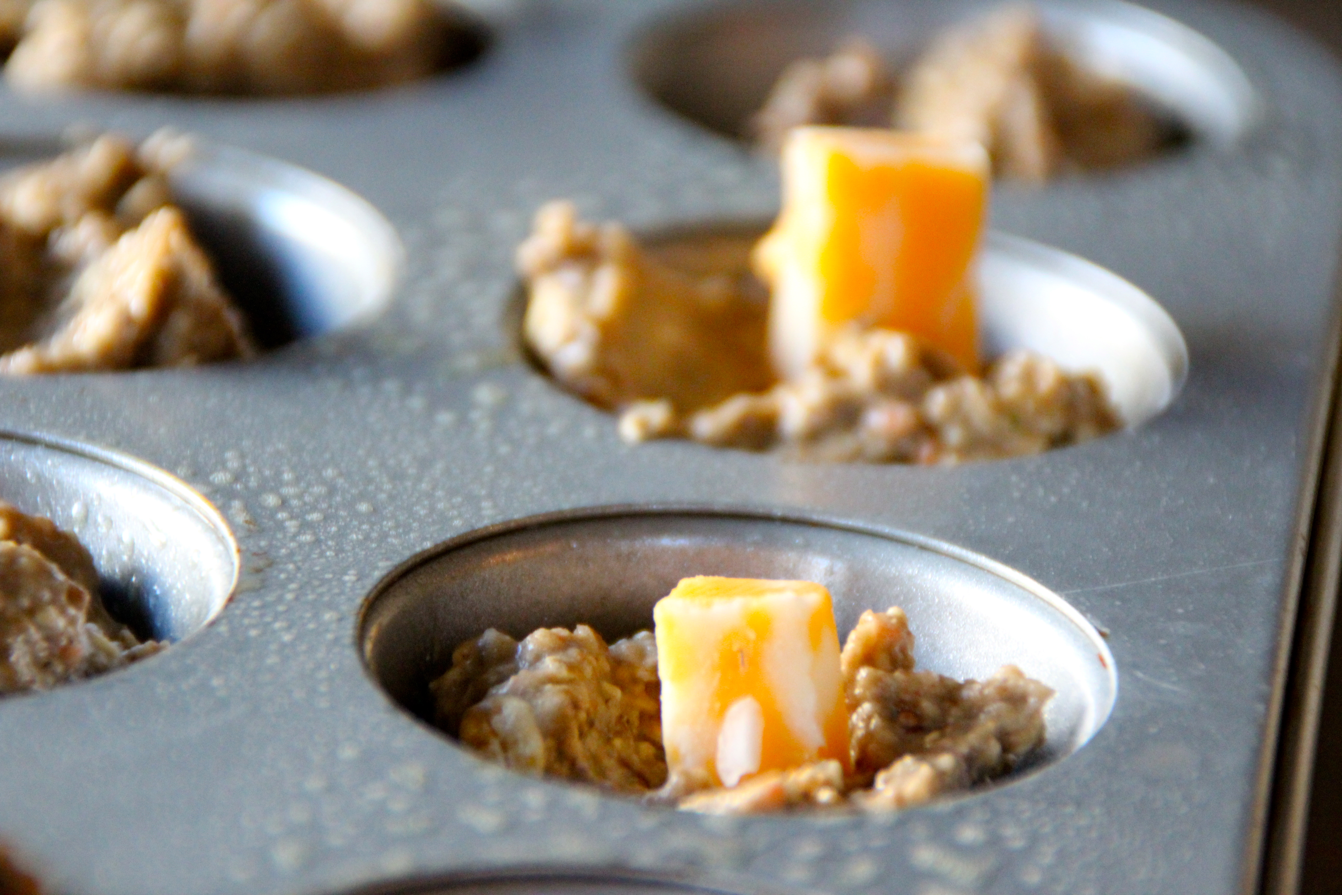 - Scoop into pre-sprayed muffin tins, but only filling half way.