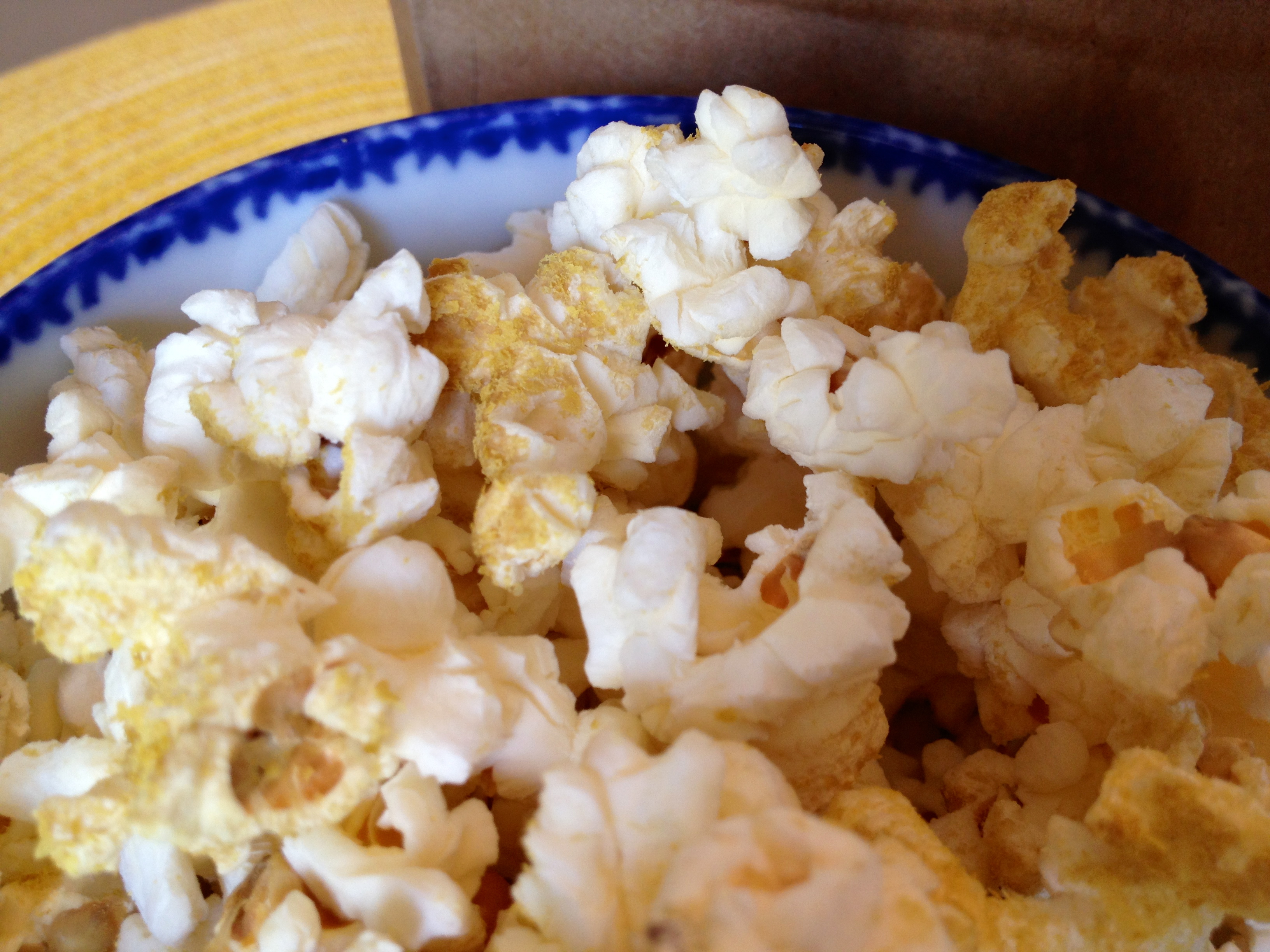 - Shake a tiny bit of nutritional yeast on the moistened popcorn.